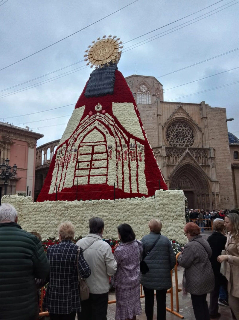Luego quisimos hacernos otra foto con la parte de atrás del manto de la Virgen. Como curiosidad, os contaremos, que este año representa la puerta de los Apóstoles de la Catedral, que está de aniversario. ¡Nos lo contó una de nuestras nuevas amigas!! Desde aquí les mandamos un saludo a todos, y le pedimos a la Virgen de los Desamparados que nos acompañe y cuide siempre con su Amor maternal. ¡¡Bendiciones!!