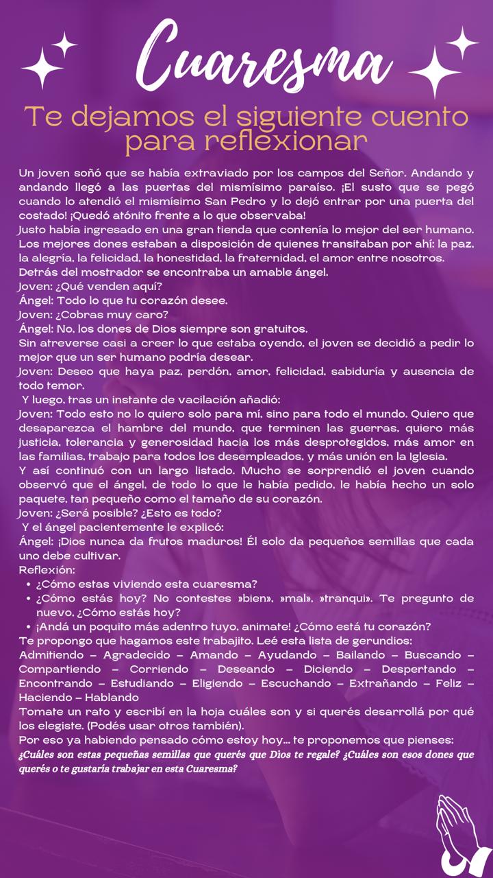 Ahora que estamos iniciando este tiempo de Cuaresma, un pequeño regalito... ¡Ojalá nos ayude a hacer una pequeña parada y reflexionar! Con la confianza de que, ante todo, nos acerque un poquito más a Jesús, que tanto nos ama, y a descubrir y conocer su Amor, y que aprendamos cada día un poquito más a amar como Él, te ofrecemos este simpático cuentecillo del que, sin duda, podemos sacar muchas cosas buenas. Oremos unos por otros siempre, y muy especialmente en este tiempo de Cuaresma. ¡Bendiciones!
